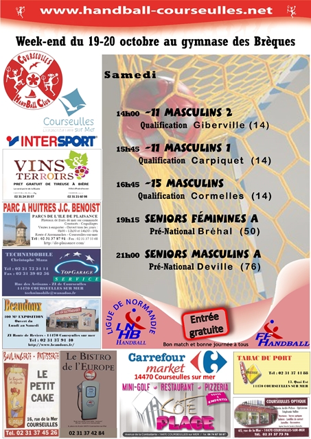 Composition de l’équipe CHBC 2: Match à Courseulles au gymnase des Brèques contre Colombelles – Samedi 16 Novembre 2013 – à 14h30